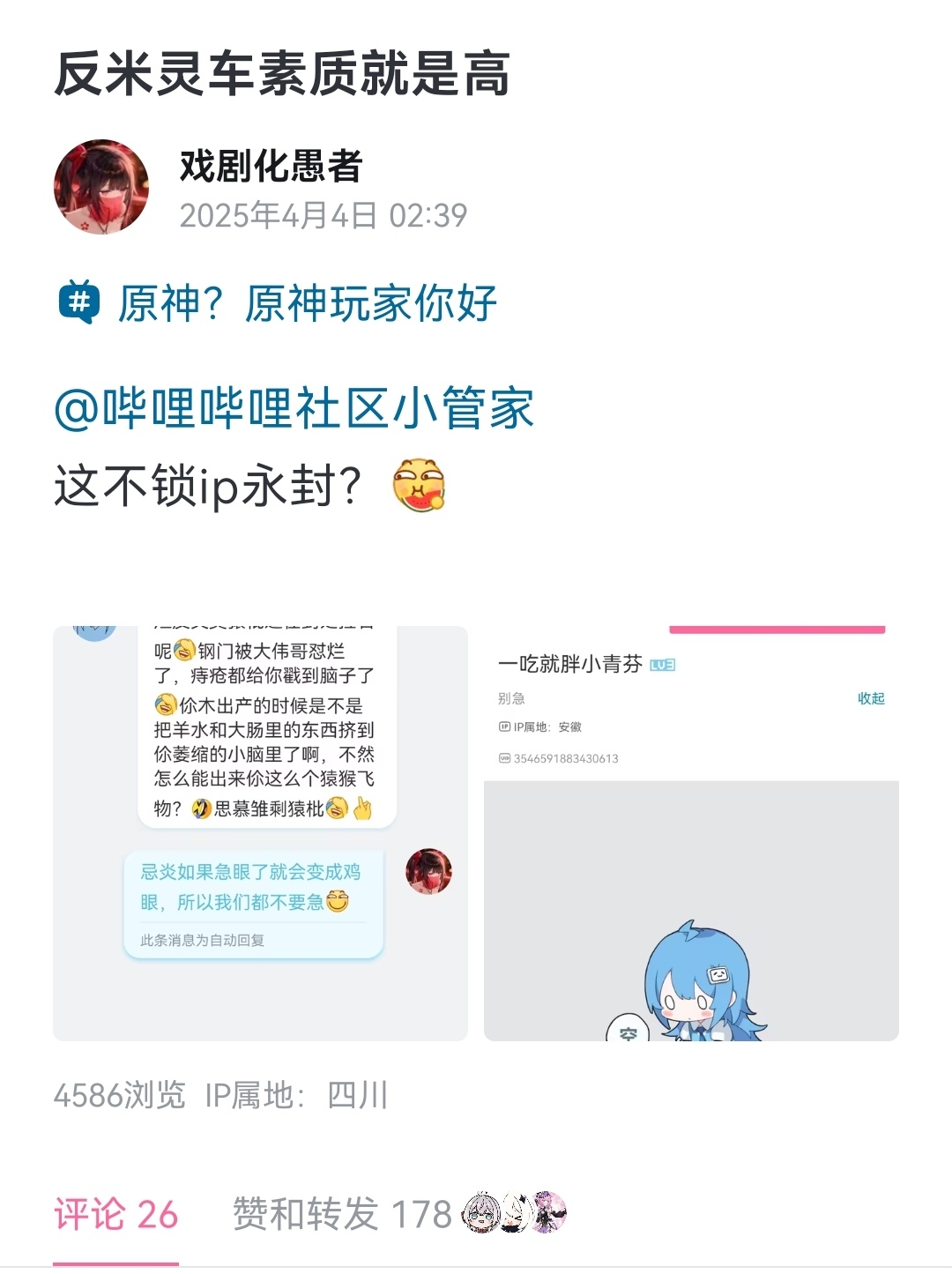 这个动态(图 1)的置顶违规喽,7 天禁言~哈哈 置顶补档:发动态之前就举报了,12 个小时了(现在 24 小时),依然没有收到任何举报反馈,@哔哩哔哩社区小管家 如果让你不爽了可以封我嘛 怎么就只是禁言呢?【吃瓜】 各位可以截图留档哦,等我被封了多多宣传 ac 的美德【doge】