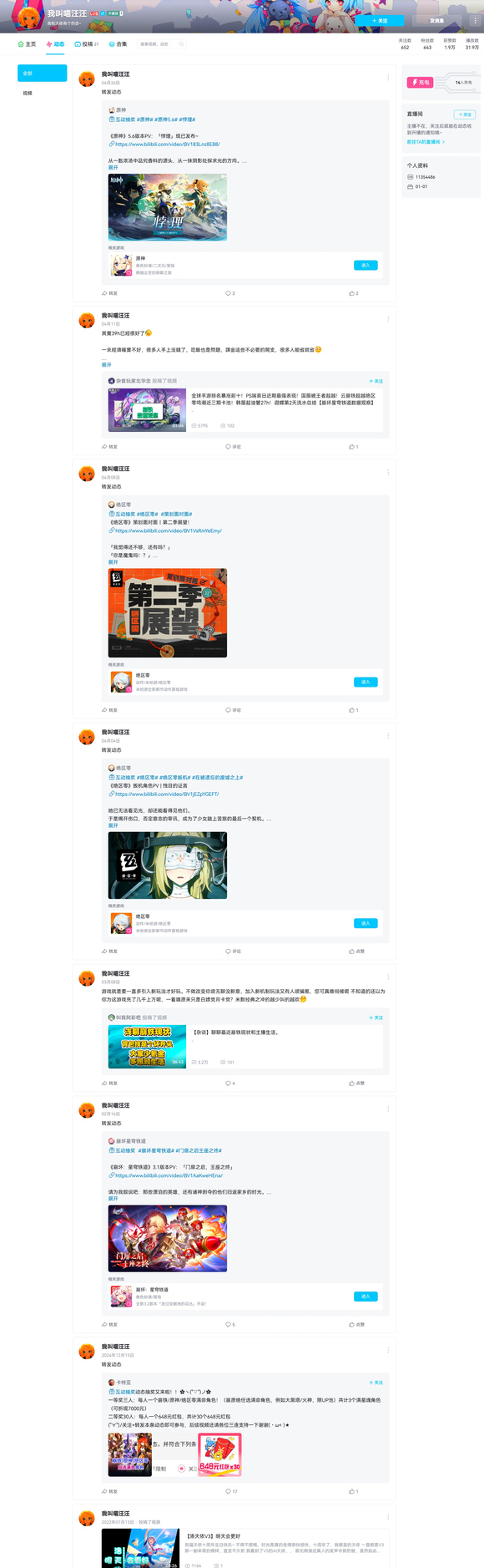 - 此人的主页,清一色的米游动态转发➕明显表面自己是米成分的发言。值得注意的是,22 年发了条动态后,到 24 年几乎就没动态了,看过往还是 b 站老用户了。