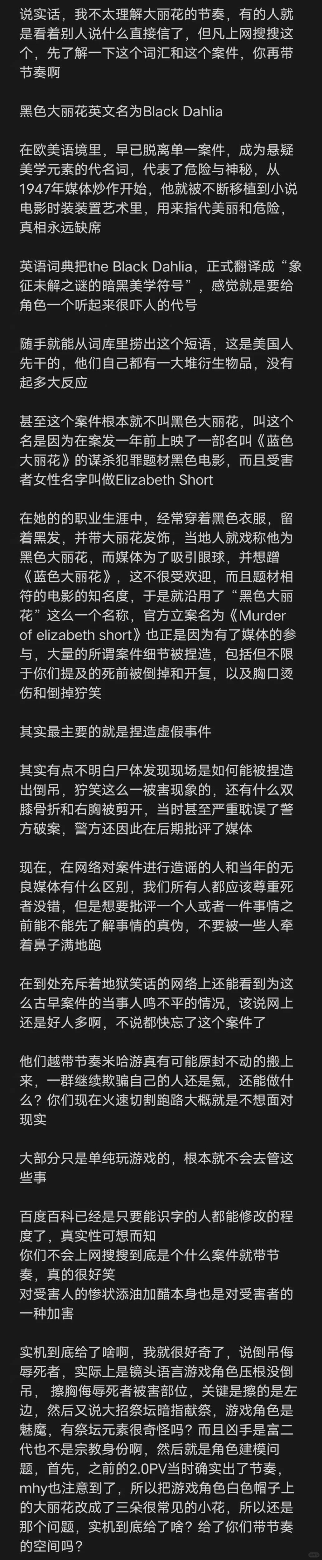 如果你坚持认为,提到大丽花就是对死者的消费,mhy 作为一个游戏公司就应该避嫌,不用这个词汇和意向,那是你的观点,我这里是辟谣帖,不要在我这里复制粘贴了。